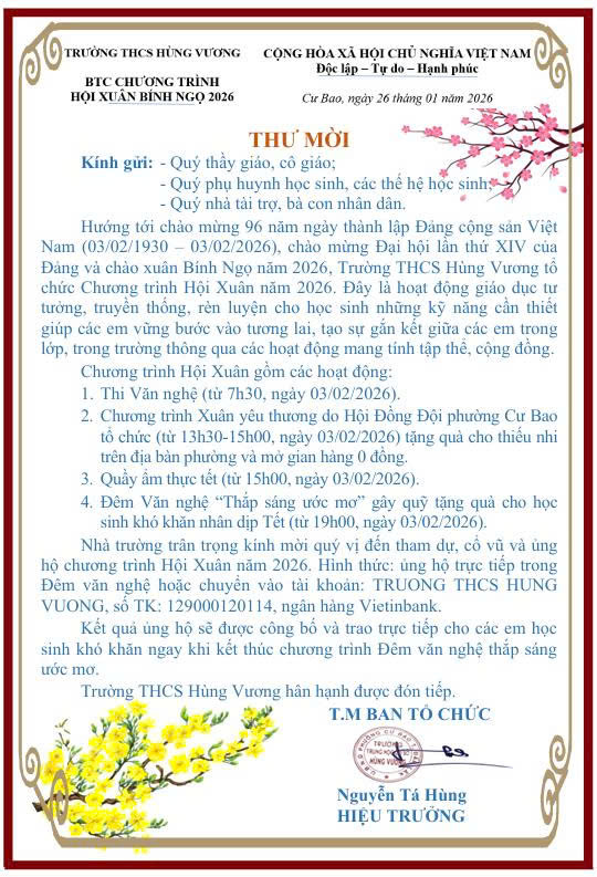 • LỊCH NGHỈ TẾT BÍNH NGỌ TRƯỜNG THCS HÙNG VƯƠNG (03/02/2026)